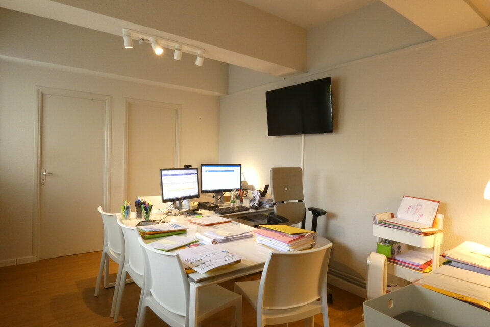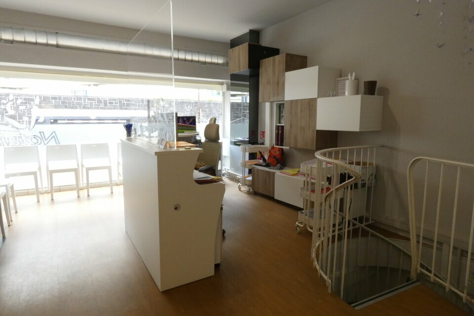 Bel accueil donnant sur vitrine, salle de réunion, bureau, sanitaire et local archives et en sous-sol, grande salle d'archivage, bureau, kitchenette et deuxième sanitaire.