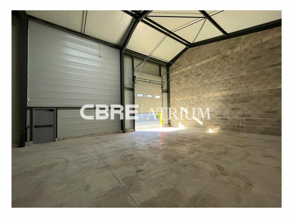 Local de 200 m² avec dalle béton, bardage double peau, arrivé eau + électricité + fibre + sanitaire, porte sectionnelle 3.50 x 4 m, hauteur sous ferme : environ 6 m.